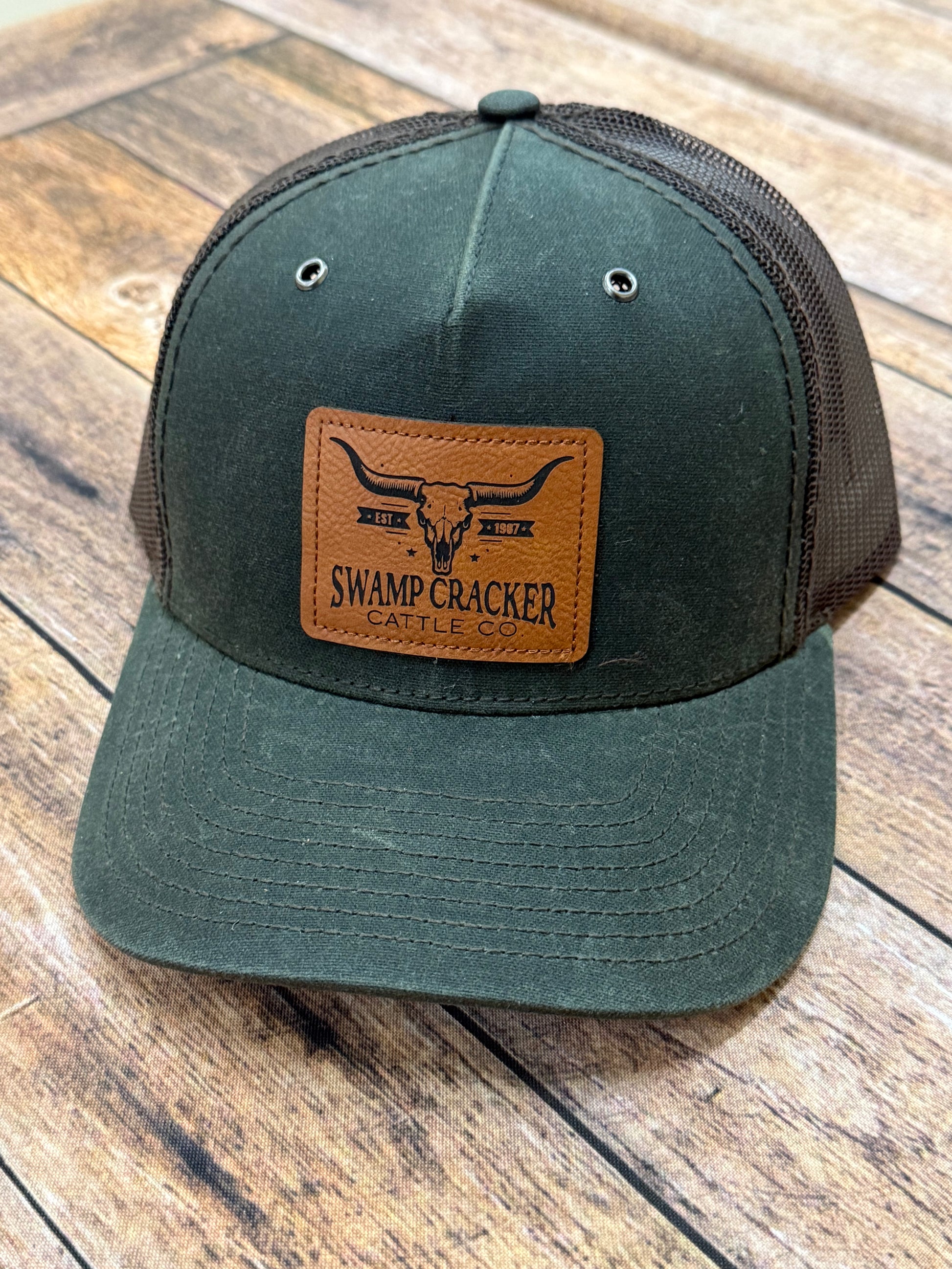 Swamp Cracker cattle company cow skull leather patch hat